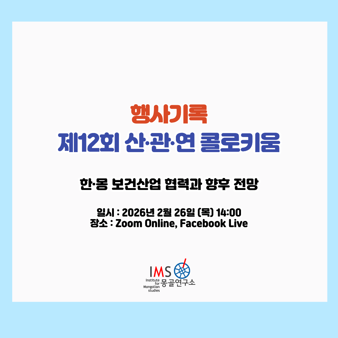 2026년 02월 26일, 한국연구재단 인문사회연구소 지원사업의 일환으로 제12회 산∙관∙연 콜로키움이 “한·몽 보건산업 협력과 향후 전망”이라는 주제로 개최되었습니다.