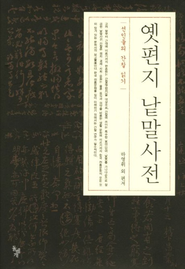 도서명(원문) 옛편지 낱말사전 도서명(국문) 옛편지 낱말사전 도서명(영문명) - 도서명(라틴자 전사) - 언어 한국어 저자 하영휘 외 6인 출판사 돌베개 출판지 파주 출판년도 2011년 자료유형 단행본 주제 사전 소장기호 713 ISBN 978-89-374-2667-4 키워드 - 원문목차서문ㄱ~ㅎ 국문목차- 간략 해제 과거부터 현재까지 전해져오는 간찰(옛편지)들을 대상으로, 간찰에 쓰이는 특수한 용어를 가나다 순으로 정리한 낱말사전이다.