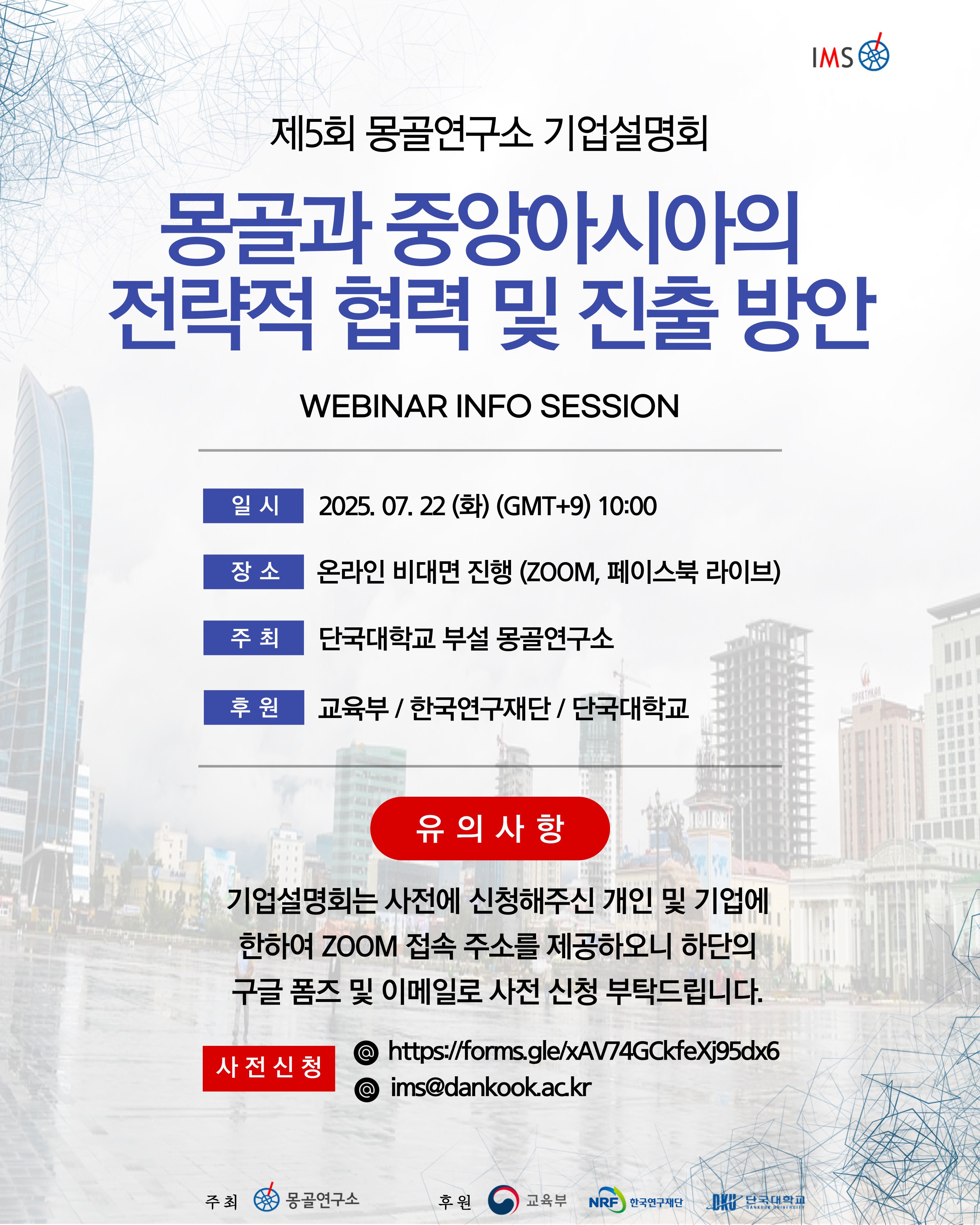 • 사전신청: https://forms.gle/xAV74GCkfeXj95dx6 (Google Forms) / ims@dankook.ac.kr (단국대학교 부설 몽골연구소 공식 이메일)