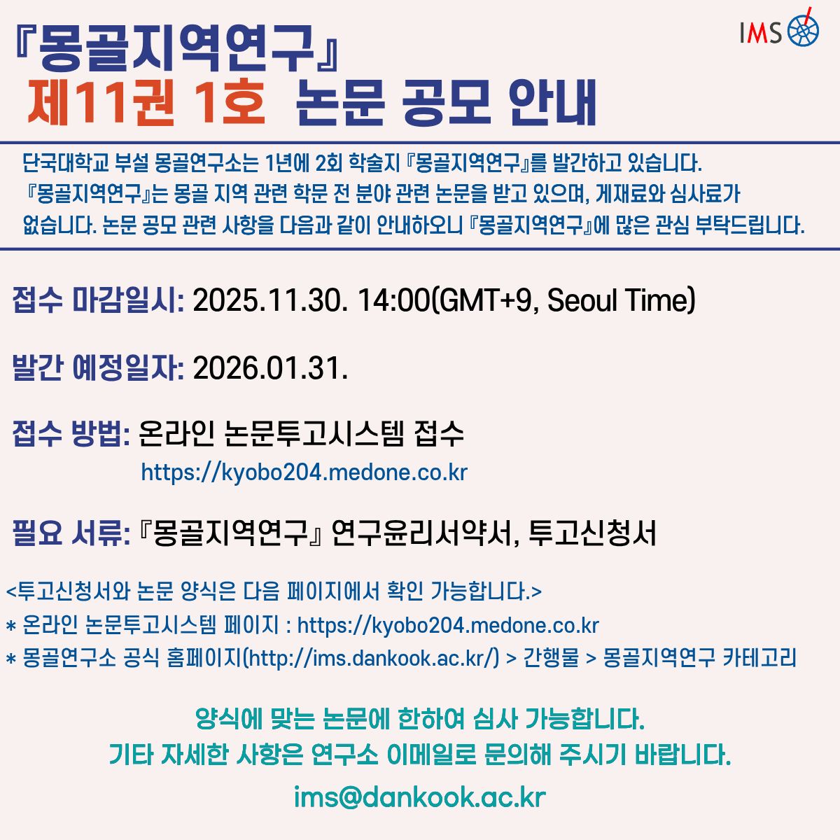 [몽골연구소] 『몽골지역연구』 제11권 1호 논문 공모 안내