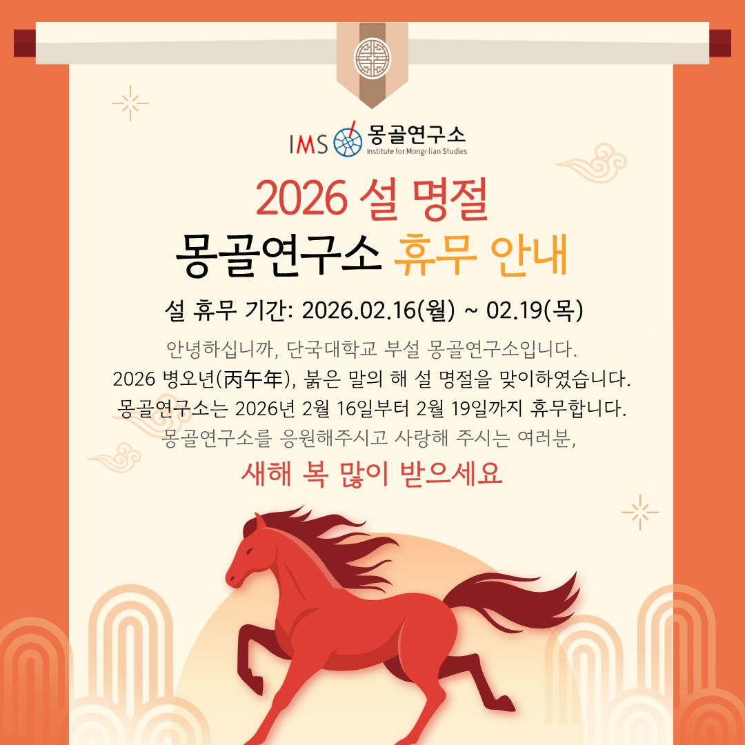 관리자 0 45 02.16 09:46 안녕하세요, 단국대학교 부설 몽골연구소입니다. 2026 병오년(丙午年), 붉은 말의 해 설 명절을 맞이하였습니다. 몽골연구소는 2025년 2월 16일부터 2월 18일까지 휴무합니다. 따뜻하고 뜻깊은 설 명절 보내시길 바라며, 건강하고 행복한 한 해 되시기를 기원합니다. 몽골연구소를 응원해주시고 사랑해 주시는 여러분, 새해 복 많이 받으세요.